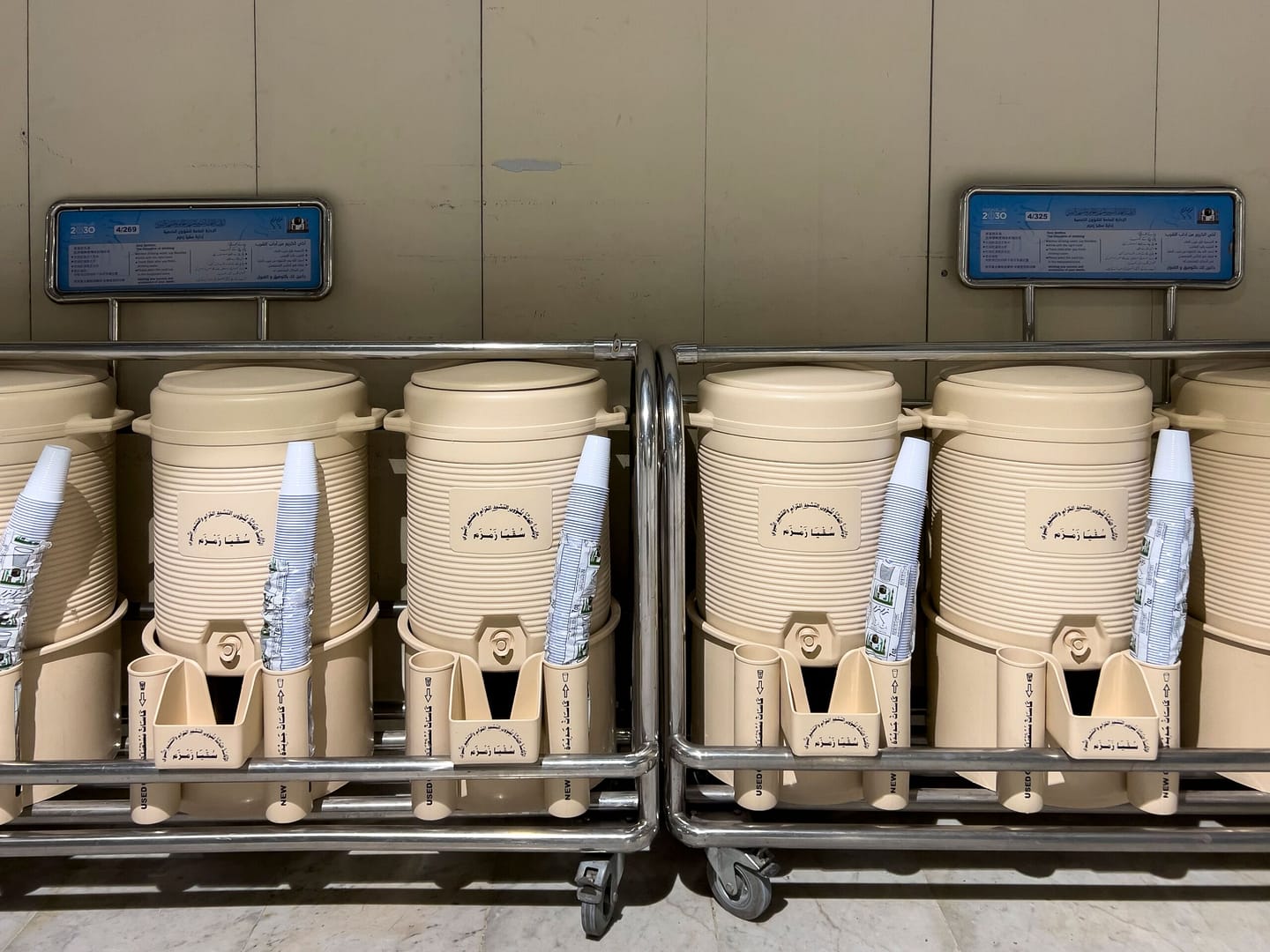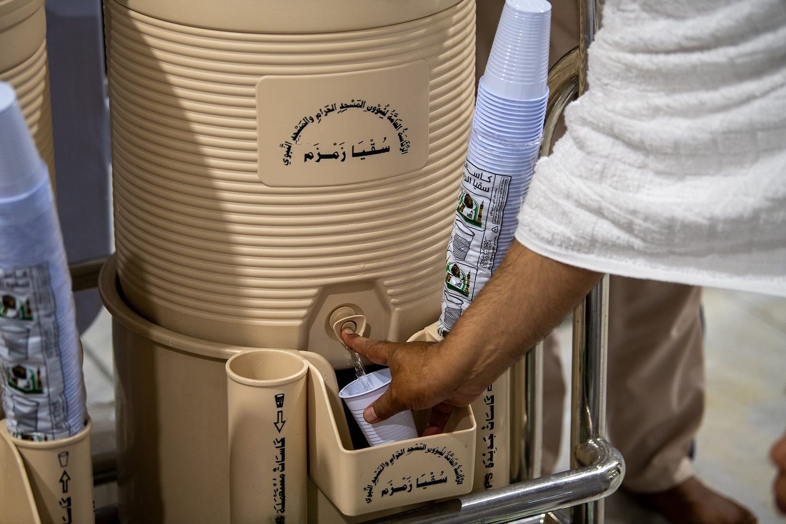 - Wadah ini disiapkan untuk minum saja. Menggunakannya untuk berwudhu atau membawanya keluar dari tanah Haram dianggap memboroskan air Zamzam, dan bisa membuat para jamaah terpeleset dan menyebabkan pencemaran.